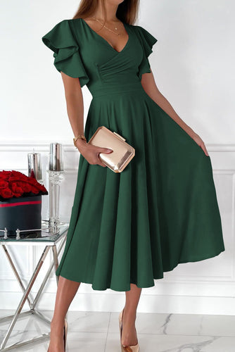 Green Ruffled Sleeve Wrap V Neck Midi Dress
