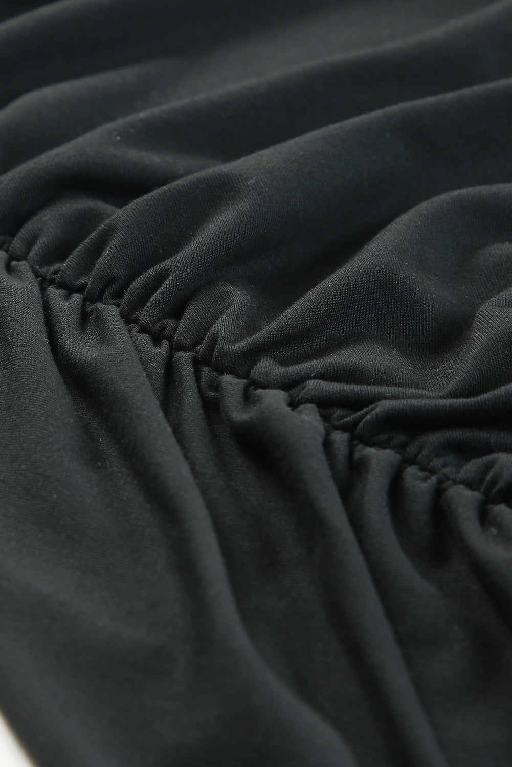 - The ruched details along one side provide a slimming ending with a notched hemline