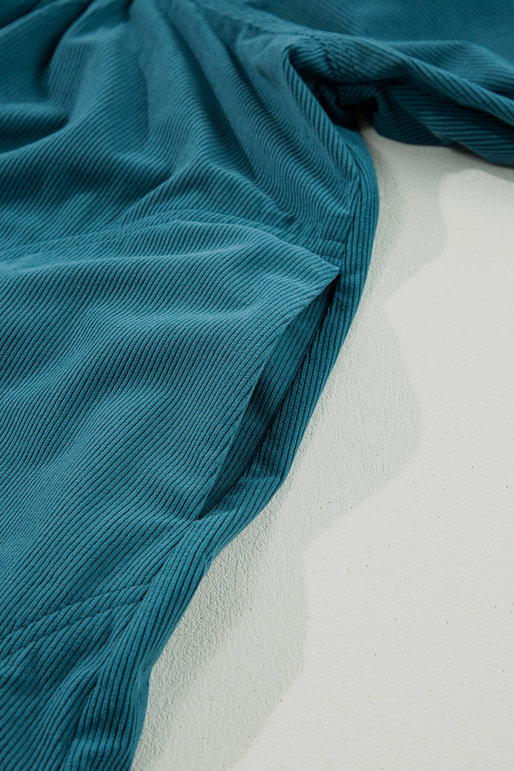 Blue Corduroy Snap Buttons Empire Waist Bracelet Sleeve Dress