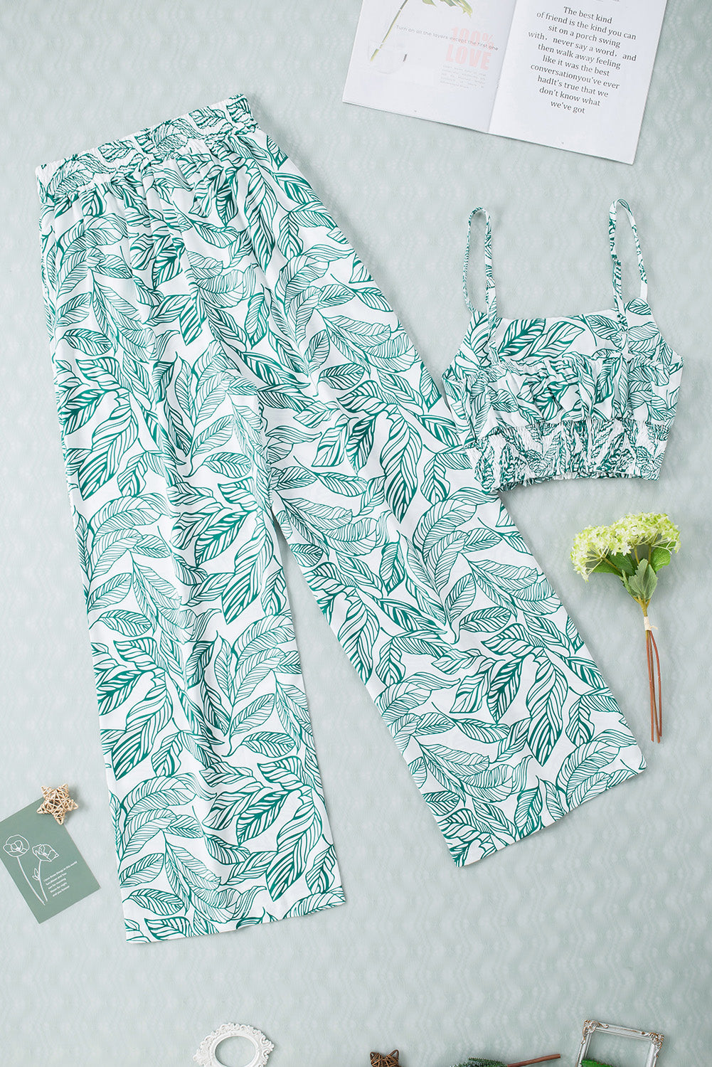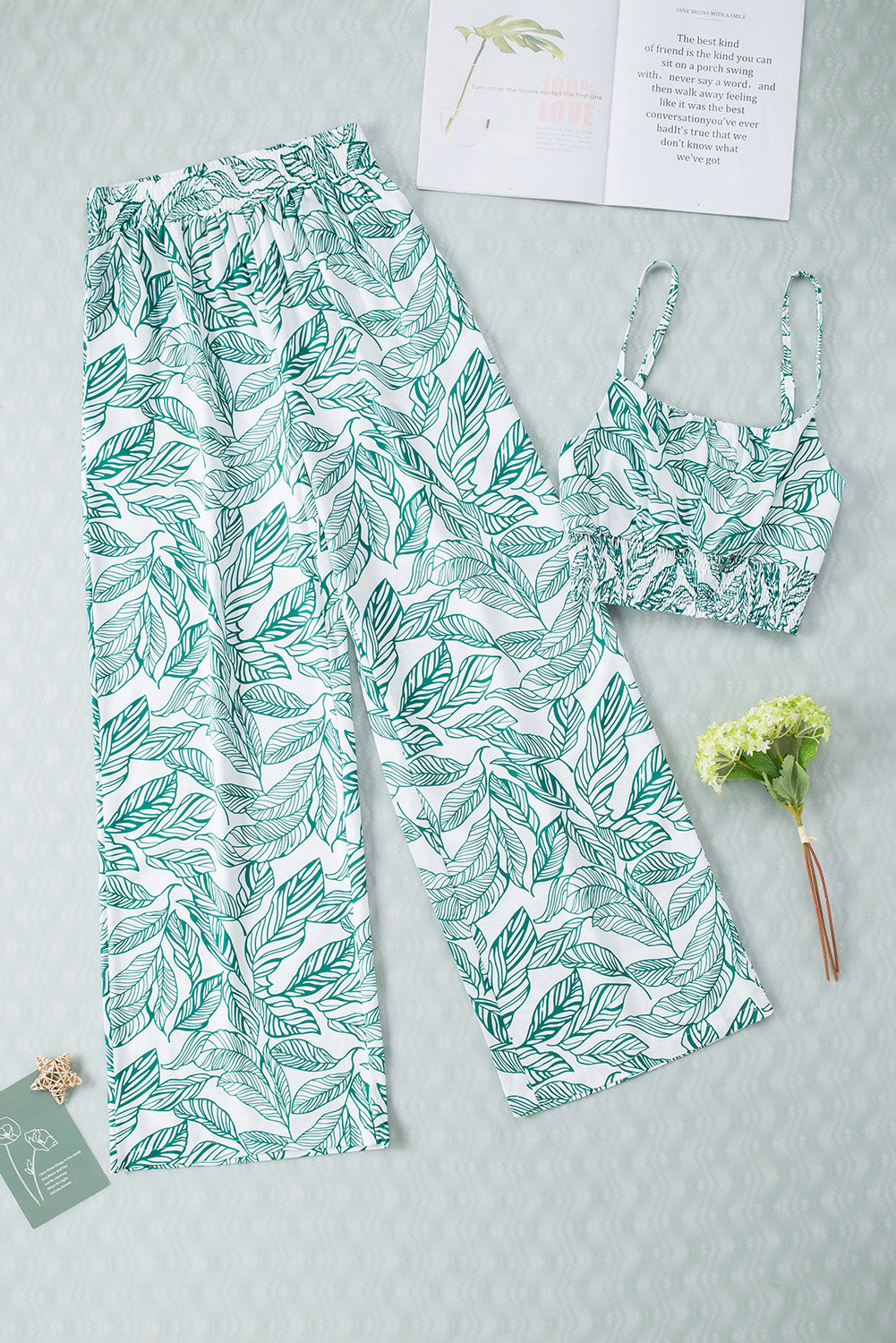 - The pants set includes a sexy crop top with spaghetti straps and wide-leg pants