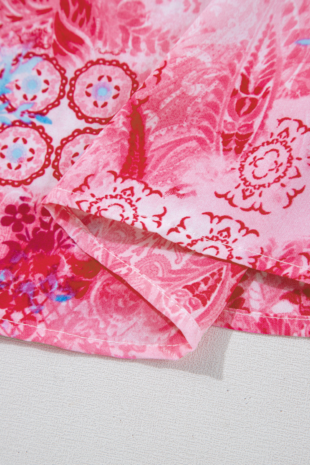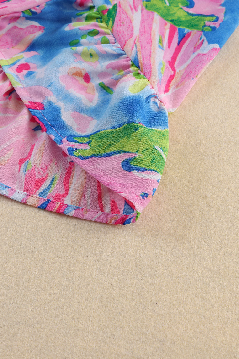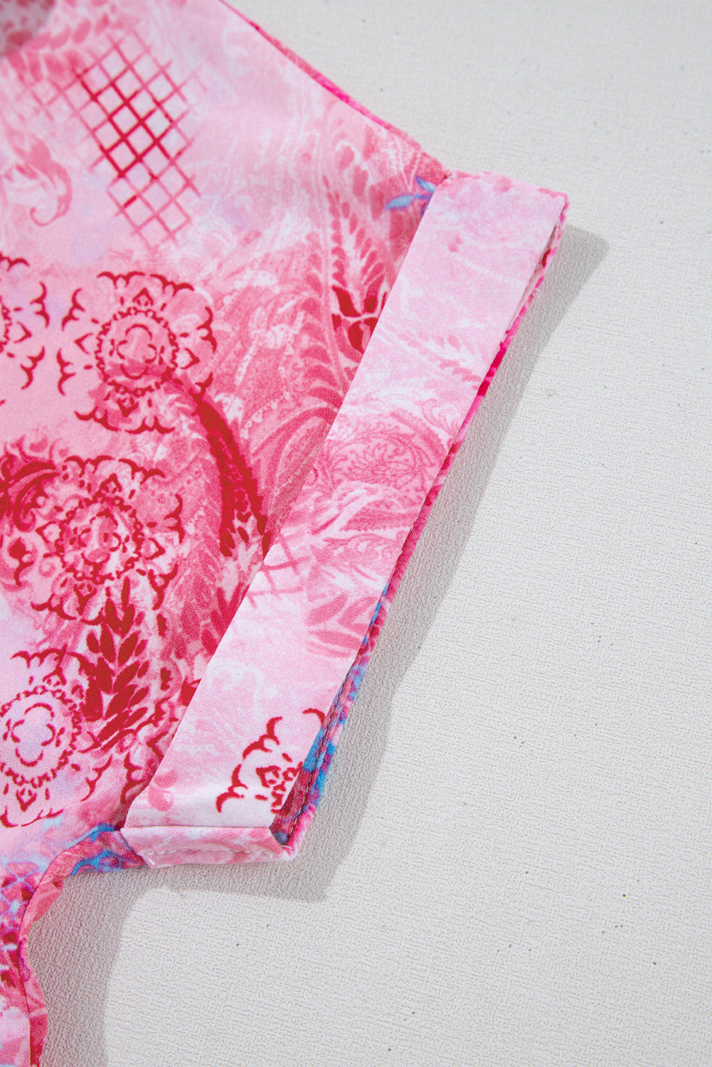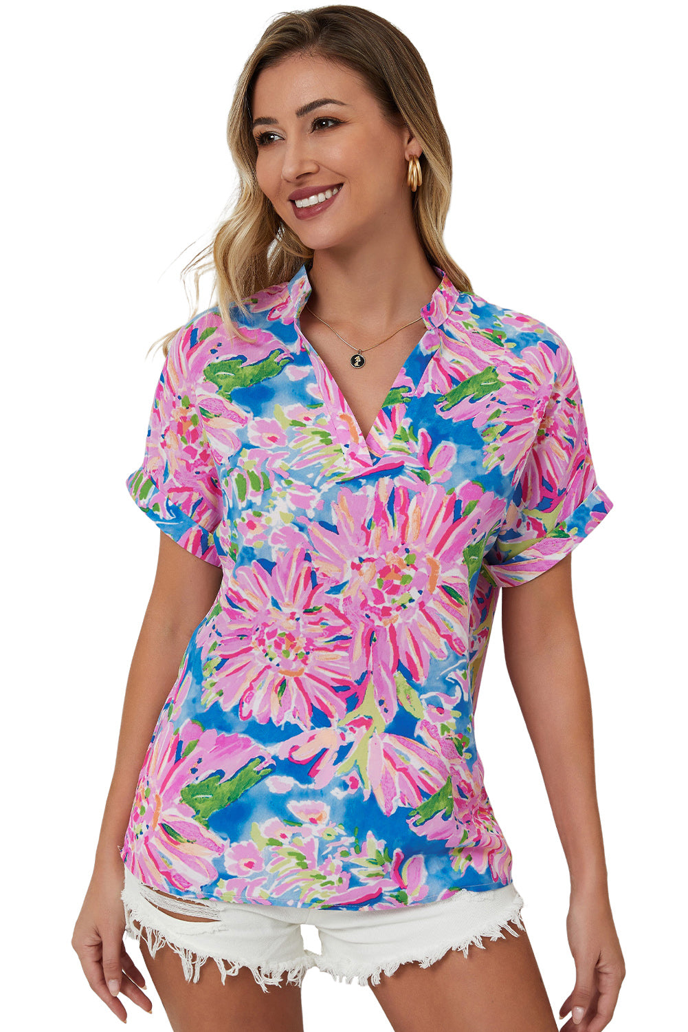 Pink Abstract Floral Print Notch V Neck Rolled Short Sleeve Blouse