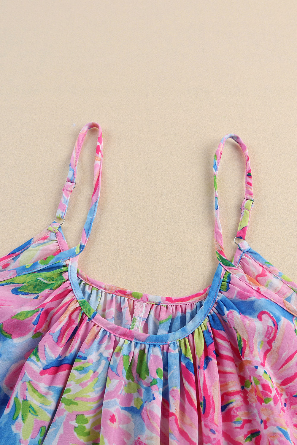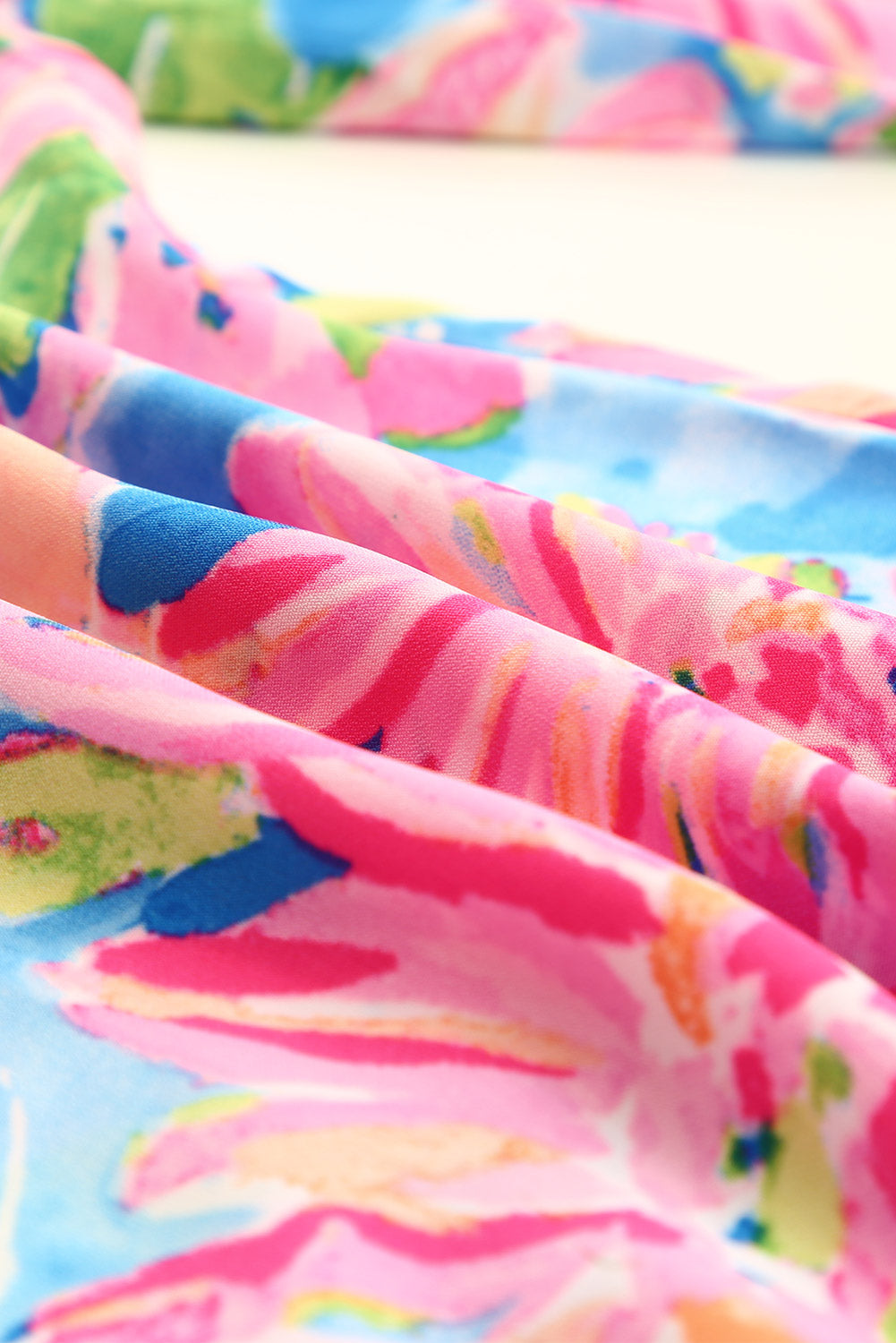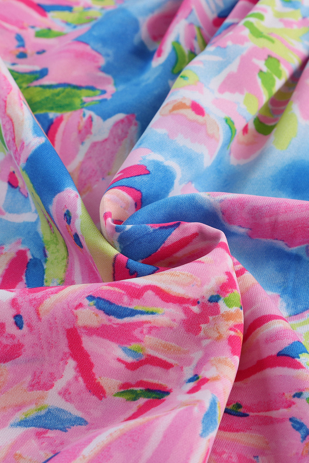 Pink Abstract Floral Print Notch V Neck Rolled Short Sleeve Blouse