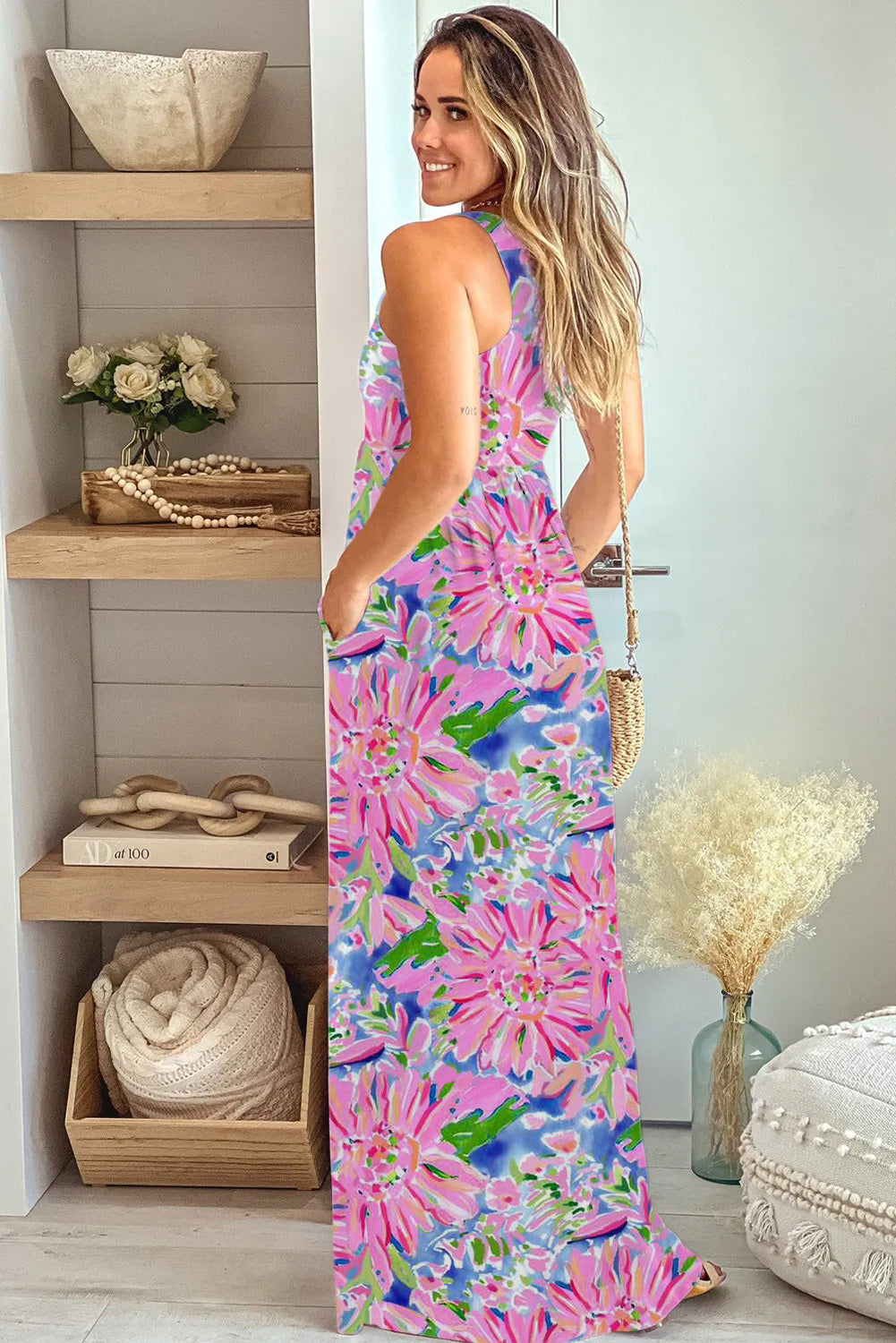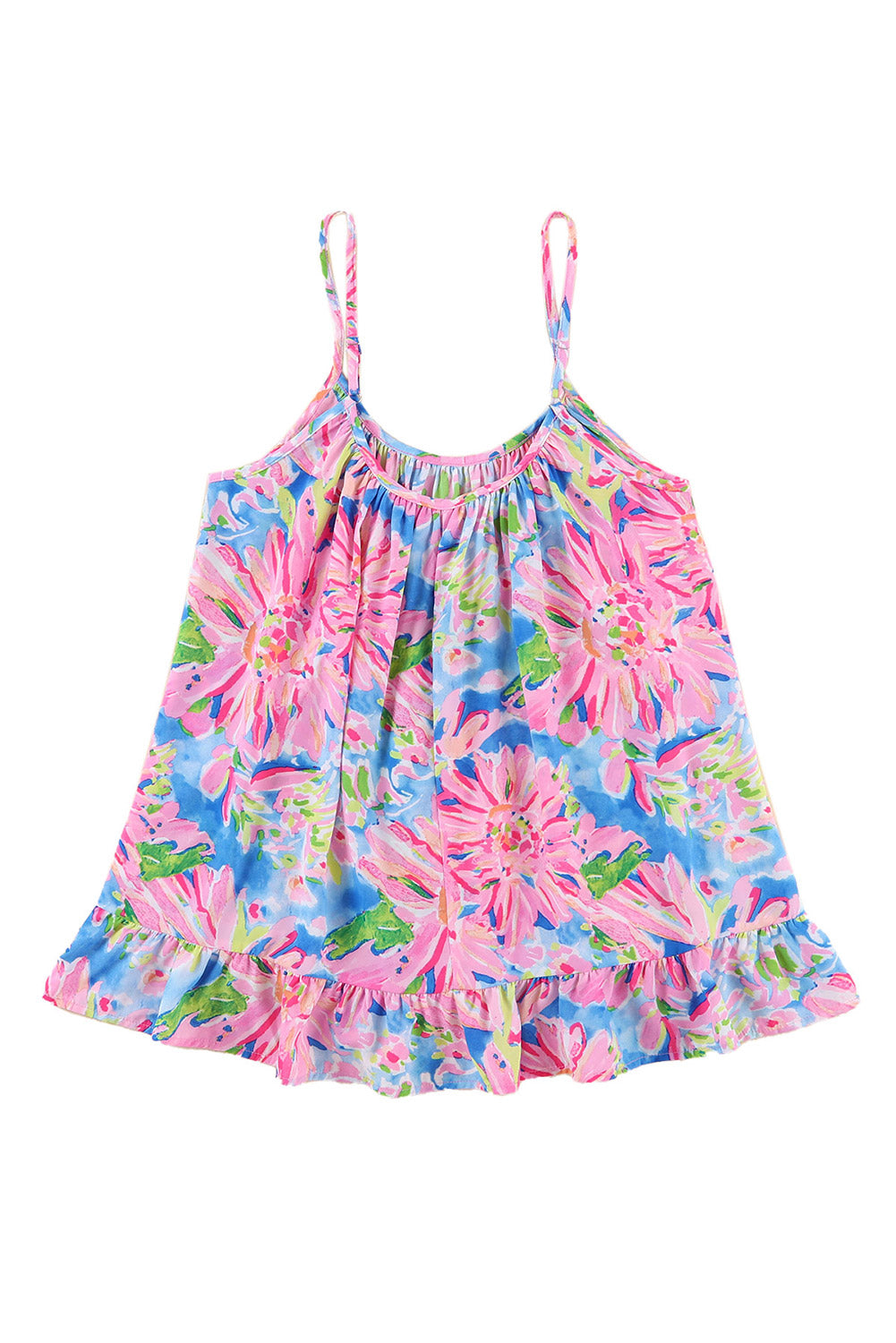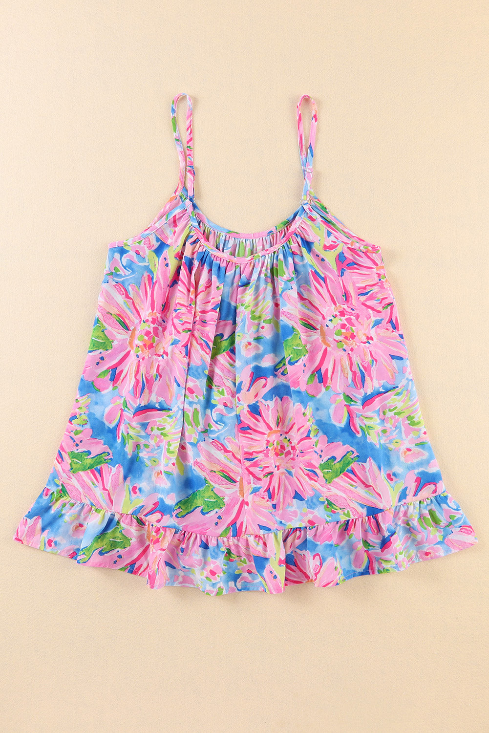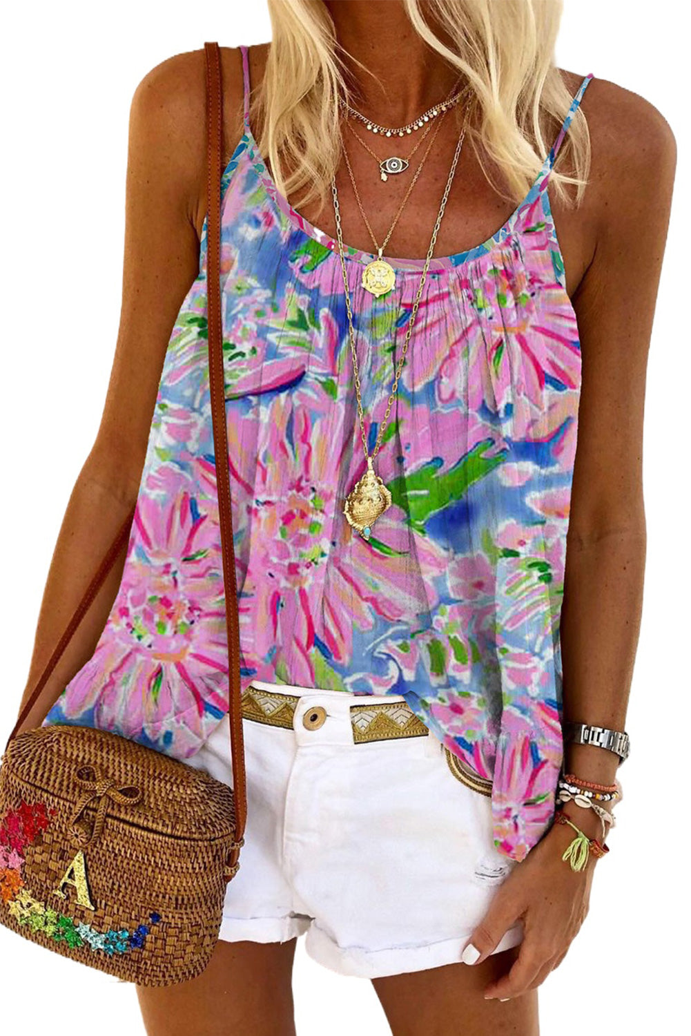 Pink Abstract Floral Print Notch V Neck Rolled Short Sleeve Blouse