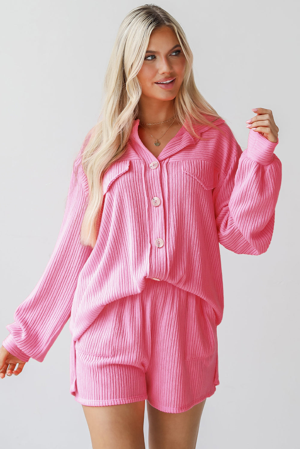 • Load image into Gallery viewer, Pink Ribbed Knit Button Top and Shorts Set
